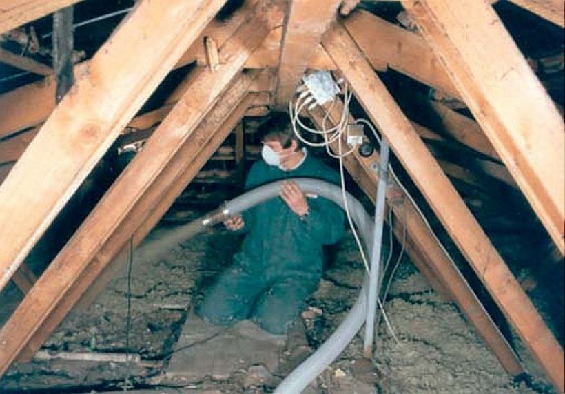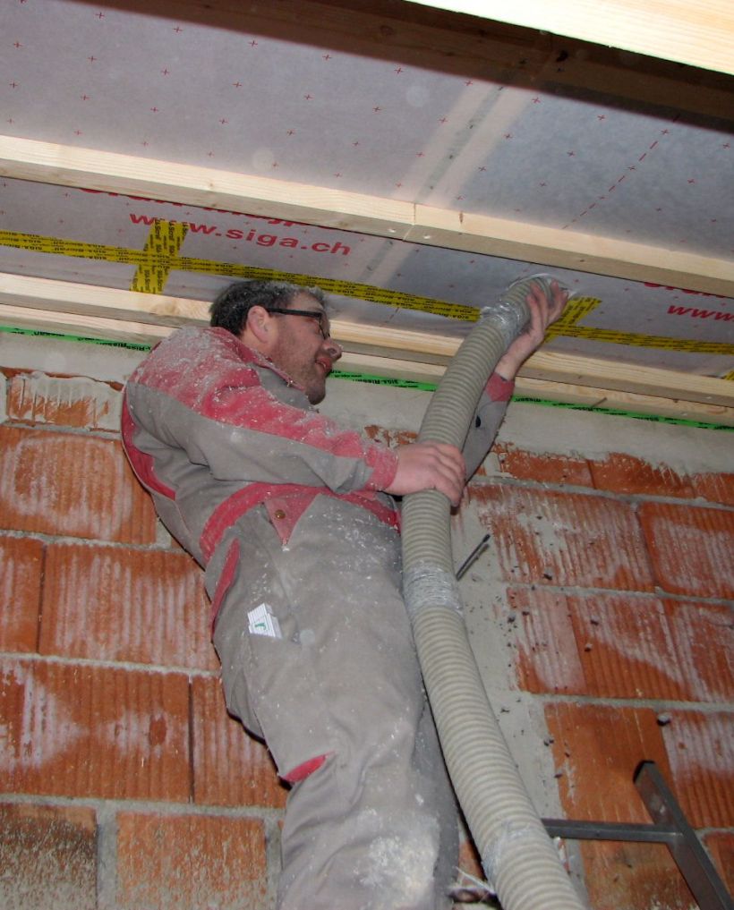 Dazu wird ein einblasfähiger Dämmstoff in einer Einblasmaschine aufbereit, mit Hilfe von Schläuchen an den Hohlraum herangeführt und über Düsen in die Hohlräume mit Druck eingeblasen.