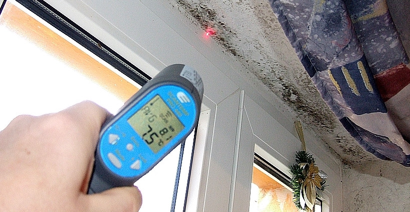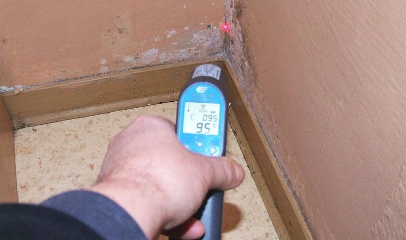 Umgekehrt lässt sich aus der Lage des Schimmelbefalls die Lage der Wärmebrücke bzw. besonders niedrige Oberflächentemperaturen gut erkennen. Ist eine Wärmebildkamera oder ein einfaches Infrarotthermometer zur Hand, kann die Verteilung der Oberflächentemperaturen messtechnisch genau verfolgt werden. Das habe ich in "Abbildungen typischer Schimmelschäden" dargestellt, indem ich Wärmebilder den realen Bildern gegenübergestellt habe.