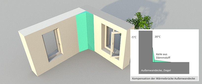 - Der Einbau von Dämmkeilen in kalte Außenwandecken und in Ecken, die durch eingebundene Innenwände entstehen, kann Schimmelbildung dort unterbinden. Diese Maßnahme ist sicher und führt zur Verbesserung der thermischen Behaglichkeit, hat aber nur wenig Auswirkung auf den Heizwärmebedarf.