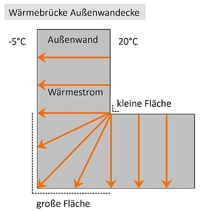 Die aus Außenwänden gebildete Raumecke ist deshalb eine Wärmebrücke, weil hier zwei Außenwände aufeinander stoßen. Das bedeutet, dass einer geringen inneren Oberfläche eine große äußere Oberfläche gegenüberliegt. Diese Geometrie führt dazu, dass die Wärme der Wände an eine große, an der Außenluft abkühlende äußere Oberfläche abgeführt wird. Die Folge ist ein Absinken der Temperatur an der inneren Oberfläche, was sehr gut in einem Wärmebild einer Raumecke erkennbar wird.