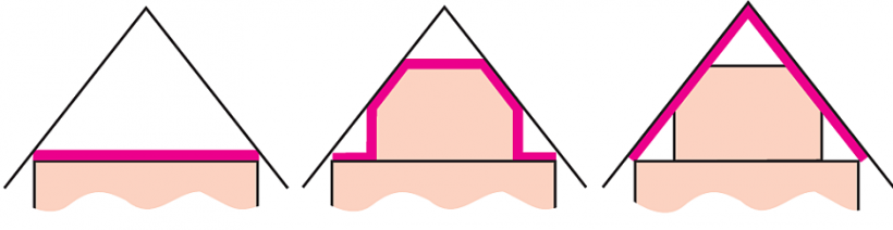 Wird das Dachgeschoss oder Teile davon ausgebaut (mittlere Abbildung), wird am Besten die mit dem Ausbau entstehende Hüllfläche der später zu beheizenden Räume gedämmt. In diesem Fall ist es wichtig sich vorzustellen, wo die Grenzflächen des Ausbaus liegen, denn hier gehört die Wärmedämmung hin.