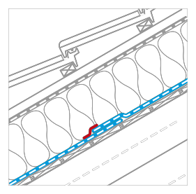 Die Luftdichtheit muss vor der Auflage der Dämmplatten hergestellt sein. Dazu wird eine Luftdichtheitsbahn auf der Schalung verlegt, überlappt und verklebt. An den Rändern der Aufsparrendämmung gibt es dabei einen kritischen Übergangsbereich zur Abseitenwand bzw. Traufe sowie zu den Giebelwänden. Dieser Übergangsbereich wird überwiegend durch eine prinzipiell empfehlenswerte Brettschalung gebildet, durch die die Luftdichtheitsbahn geführt werden muss. Eine weitere Möglichkeit besteht darin, die Luftdichtheitsbahn um die Schalung herum zu ziehen und am geputzten Mauerwerk luftdicht zu verkleben. Wegen häufiger Ausführungsmängel kommt es hier oft zu Unterbrechungen der Luftdichtheitsebene.