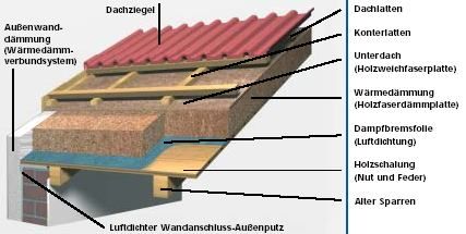 Die Aufsparrendämmung verlangt bei Ersatz oder erstmaligem Einbau eine Dämmstoffstärke, die sich aus dem Gebäudeenergiegesetz (GEG) bzw. den staatlichen Förderbedingungen (KfW) ergibt. Das GEG verlangt im Sanierungsbereich einen einzuhaltenden U-Wert von 0,24 W/m²K, was einer Dämmstoffstärke von mindestens 14 bis 16 cm (gute Dämmeigenschaften des Dämmstoffes, WLG 0,035, Berücksichtigung der Sparrenanteile) entspricht. Soll eine Förderung (KFW) in Anspruch genommen werden, muss der Dämmstoff im Steildach so stark sein, dass ein U-Wert von 0,14 W/m²K erzielt wird.