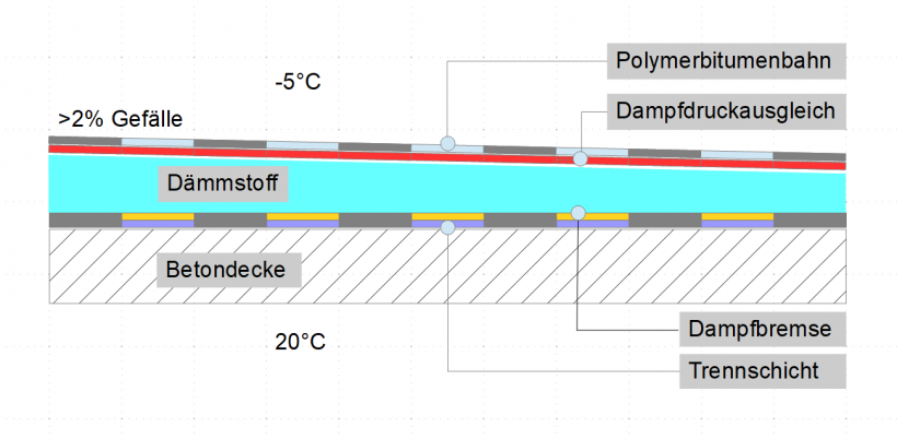 - Zur Wärmedämmung eignen sich beispielsweise Mineralfaserplatten, Polystyrol PS, expandiertes Polystyrol EPS, extrudiertes Polystyrol XPS und Schaumglas. Bei Schaumglas auf Betonkonstruktionen ist eine Dampfbremse/sperre nicht erforderlich, da der Dampfdiffusionswiderstand sehr hoch ist. Nach dem Einbau ist die Schaumglasplatte druck- und feuchteunempfindlich. Die Wärmedämmschicht kann auch zur Herstellung des benötigten Mindestgefälles dienen.