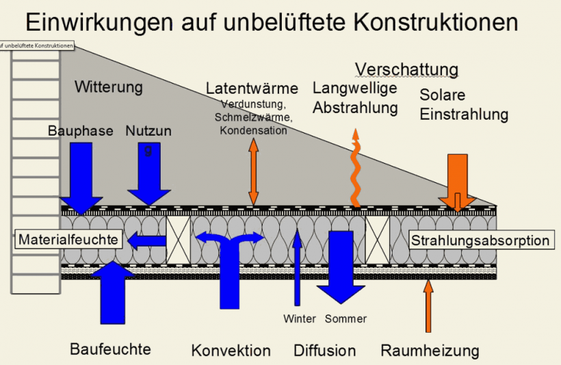 - Belüftung: Bei bestimmten Konstruktionen (z.B. Kaltdach) ist eine ausreichende Belüftung wichtig, um Feuchtigkeit abzuführen. Wird der zur Belüftung erforderliche Hohlraum vollständig mit Dämmstoff gefüllt, wird aus dem Kaltdach ein Warmdach. Dies verlangt fachlich einwandfreie Kenntnisse über den Aufbau und die notwendigen Eigenschaften von Luftdichtheitsebene und Dampfbremse.