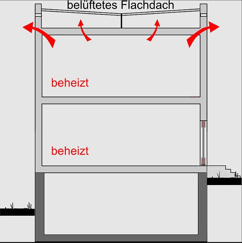 Ein Flachdach kann als nicht belüftetes (Warmdach) oder als belüftetes Dach (Kaltdach) ausgeführt werden.