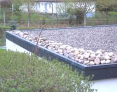 - Eine Kiesschicht mit einer Dicke von 5 bis 10 cm kann dem Schutz vor direkter Sonneneinstrahlung, Windsog und mechanischer Beschädigung dienen. Als Oberflächenschutz finden auch Plattenbeläge, Begrünungen, Schiefersplitt u.a. Verwendung.