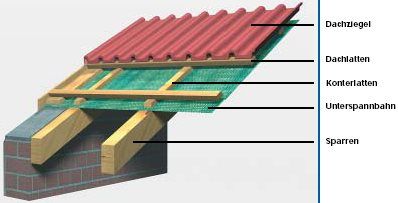 Die Abbildung zeigt den typischen Aufbau eines Unterdaches mit einer über den Sparren verlegten Unterspannbahn (grünlich). Mit den Konterlatten (senkrecht) wird die Unterspannbahn fixiert. Die Konterlatten mit einer Höhe von 3 bis 4 cm ermöglichen die Belüftung über dem Unterdach bzw. unter den Dachziegeln. Die Dachlatten sind horizontal auf den Konterlatten fixiert, um die trocken verlegten Dachziegel aufzunehmen.
