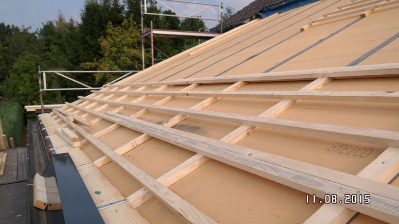 Nicht nur feuchte Dämmschichten, auch solche, durch die der Wind fegt, haben kaum noch eine Wärme dämmende Wirkung. Daher ist das Unterdach winddicht herzustellen. Das gelingst besonders gut und einfach mit Holzfaserdämmplatten. Das Foto zeigt ein zeitgemäßes Unterdach aus diffusionsoffenen Holzfaserdämmplatten, sowie die Konter- und Dachlattung.