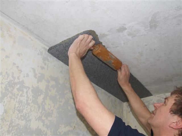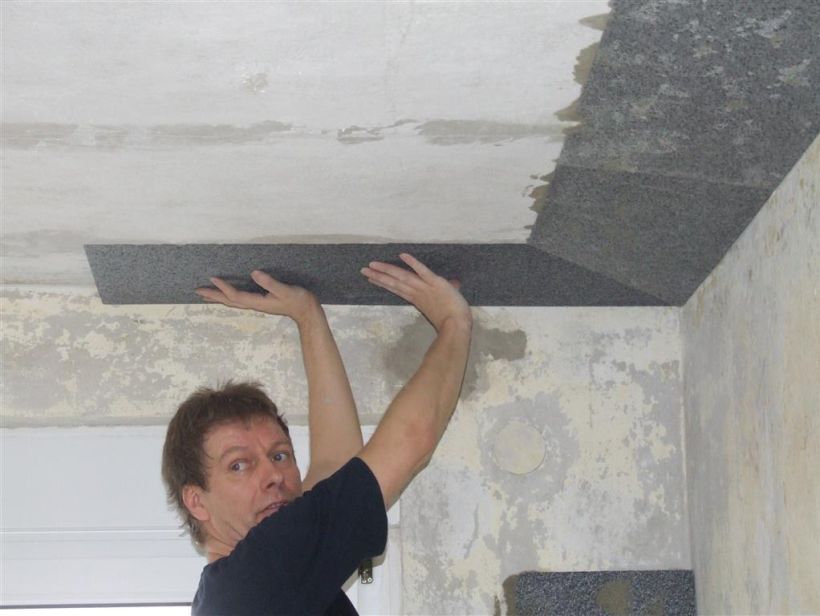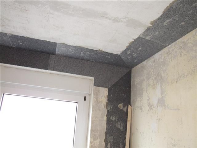 Beim Ankleben der Dämmkeile an der massiven Geschossdecke wird genauso vorgegangen. Wenn es eine glatte Fläche gibt, hält die Platte mit dem Kleber ohne weitere Hilfsmittel an der Decke.