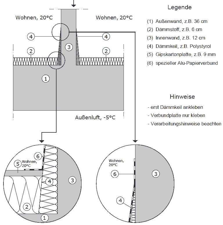 Dämmkeile gehören auch an Innenwände, die in eine Außenwand eingebunden sind. Werden beide von der Innenwand getrennte Räume beheizt, sind auch die Dämmkeile beidseitig anzusetzen. Dabei sind immer erst die Dämmkeile in die Ecken zu kleben, danach ist die Gipskartonverbundplatte anzusetzen. Man kann die Gipskartonplatte, wenn der Dämmstoff dies zulässt, vorher etwas anschrägen oder/und nach dem Aushärten des Klebers den entstehenden Zwischenraum mit PU-Schaum füllen. Die abgebildete Schicht aus einem speziellen Material (Papier-Alu-Papier-Folie, etwa 0,3 mm stark) dient der Erhöhung der Oberflächentemperatur durch Wärmeleitung am auslaufenden Keil (+10 cm) und wird empfohlen.