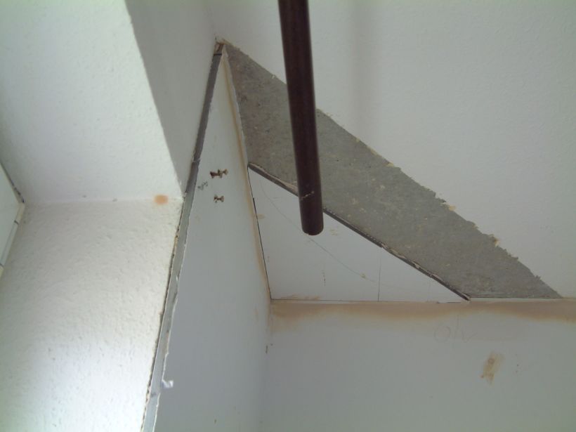 An der Unterseite von massiven Decken habe ich im Auflagerbereich häufiger Schimmelprobleme vorgefunden. Bautechnische Ursache ist die Wärmebrücke, die durch die Auflage einer schwach gedämmten Geschossdecke auf der ebenfalls schwach gedämmten Außenwand entsteht (Alt- und Neubau!). Die Dämmkeile werden hier an die Unterseite der Decke so in die Ecke geklebt, dass der auslaufende Keil zum Raum hin zeigt. Wenn sorgfältig gearbeitet wird, ist der „Auftrag“ der durch den Keil entsteht unter der Deckentapete kaum zu erkennen.