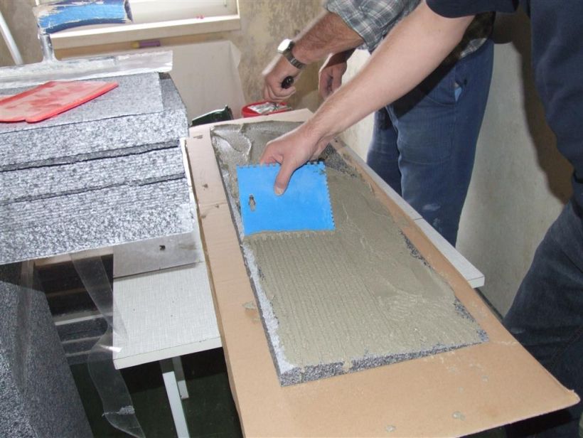 Der mineralische Kleber wird dann nach Vorschrift angerührt. Bevor der Kleber vollflächig mit einem Zahnspachtel (Zähnung 6 – 8 mm) aufgetragen wird, sollte der für die Klebung vorgesehene Keil probehalber trocken in die Ecke eingeschoben werden. In der Regel muss nun noch ein etwa 1 cm schmaler Streifen vom rechten Winkel abgeschnitten werden, da Raumecken nicht exakt rechtwinklig, sondern eher rundlich ausgeputzt sind.