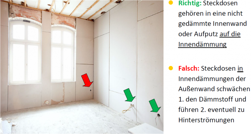 Unabhängig vom verwendeten Dämmstoff und der Wahl der raumseitigen Oberfläche darf der Dämmstoff nicht hinterlüftet, also von Raumluft hinterströmt werden. Steckdosen und andere luftdurchlässige Durchdringungen gehören möglichst nicht in die innengedämmte Außenwand. Die Verlegung des Dämmstoffs einer Innendämmung muss zum Raum hin lückenlos und luftdicht erfolgen. Besondere Vorsicht ist bei Holzbalkendecken geboten. Hierbei muss auf besonders gute Luftdichtheit der Konstruktion geachtet werden (Link Konstruktionsdetails Innendämmung bei Holzbalkendecke).