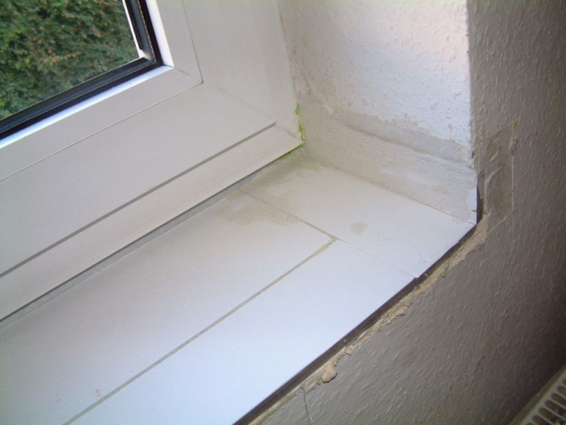 An den Rändern links und rechts bis 3 cm ausstemmen und Dämmstoff einbringen, so dass die Stirnseiten der neun Fensterbank gegen Dämmstoff liegen. Hölzerne Fensterbänke, auch Werzalit o.ä., sind in der Länge soweit zu kürzen, dass der Dämmstoff an den senkrechten Laibungsflächen bis auf das Mauerwerk heruntergeführt werden kann.