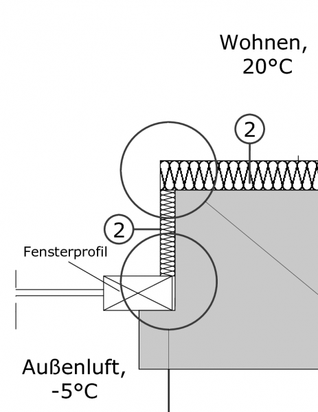 Eine problematische Wärmebrücke stellen in die Außenwand eingebundene Innenwände und Geschossdecken dar. Um die von diesen Bereichen ausgehende Gefahr der Schimmelbildung zu vermeiden, empfiehlt sich auch hier die Anwendung von Dämmkeilen.