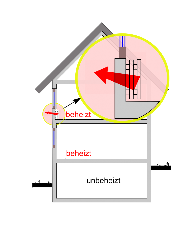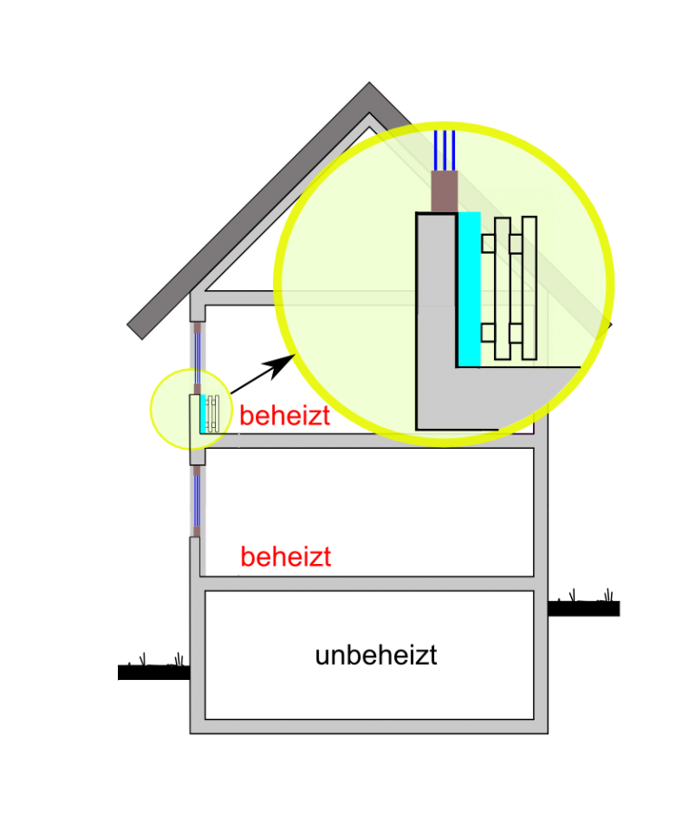Ein hoher Wärmeverlust entsteht in Bereichen der Außenwand dort, wo Heizkörper angebracht sind. Besonders hoch ist der Verlust durch die früher üblichen Heizkörpernischen. Die Außenwand ist in der Nische häufig von 48 cm bzw. 36 cm auf 24 cm Dicke reduziert, manchmal sogar nur auf 12cm. Damit konnten Heizkörper, die in der Nische angebracht sind, optisch „verschwinden“. Jedoch führt die Reduzierung der Wandstärke auch zu einer verringerten Wärmedämmung an der Stelle, wo wegen der Heizkörpertemperaturen eher das Gegenteil der Fall sein sollte.