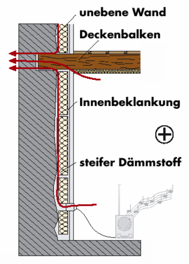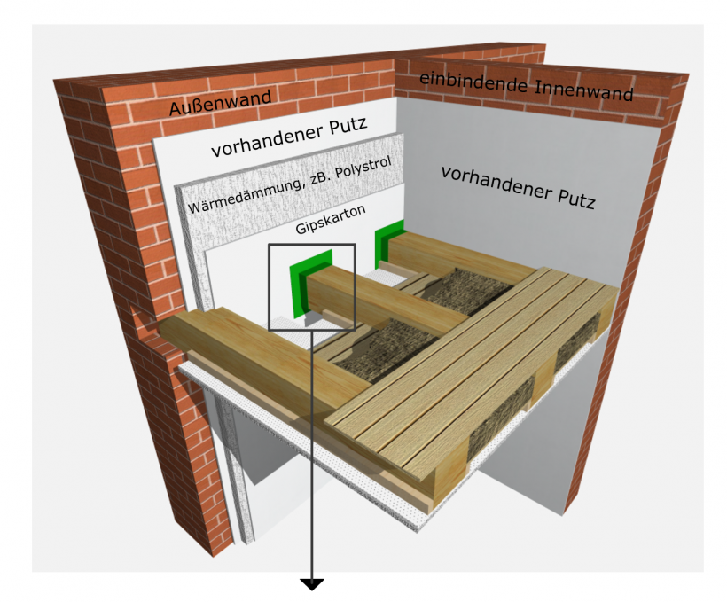 Eine Innendämmung in Häusern mit Holzbalkendecke ist aufwändig und anspruchsvoll. Aufmerksamkeit verlangen neben der Ausführung der Dämmung selbst die Holzbalken, und hierbei insbesondere die sogenannten Balkenköpfe. Bei Holzbalkendecken liegen die Balkenköpfe meist in luftumspielten Hohlräumen der Außenwand. Sie werden daher durch eine nachträgliche Innendämmung schlechter von innen erwärmt. Gegenüber der Stirnseite des Balkens ist die Außenwandstärke reduziert, in dem Hohlraum rund um den Balkenkopf ist es kühler. Optimal wäre es, den Balkenkopf von der Stirnseite her diffusionsoffen zu dämmen, z.B. mit einer Holzfaserdämmplatte. Achtung: Keine Folien um den Balkenkopf wickeln!!! Auf jeden Fall sollte man den Wandzwischenraum in der Decke zwischen den Balken mit dämmen. Dazu die ersten Dielenbretter entfernen und die Innendämmung gleich bis zum darunter liegenden Raum durchziehen.