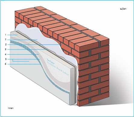 - Die Ausführungen von Innendämmungen sind vielfältig. Sie reichen von Verbundplatten, bei denen die Deckplatte werkseitig mit dem Dämmstoff verklebt ist (wahlweise mit integrierter Dampfbremse), über eine Innendämmung zwischen einer Holzlattenkonstruktion bis hin zu Systemen, bei denen der Innenputz (Nassputz) direkt auf die Dämmplatten aufgetragen wird.