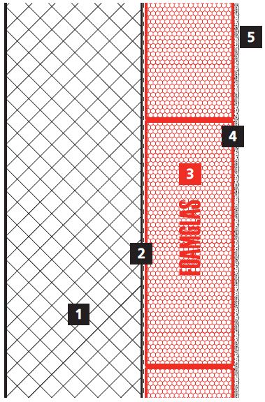 Schaumglasplatten werden mit Hilfe von Bitumen o.ä. Kaltkleber vollflächig aufgeklebt. Der Innenputz erfolgt unter Einlage eines Gewebes oder Verkleidung mittels Trockenputz. Diese Konstruktion ist nahezu dampfdicht und kapillarsperrend.