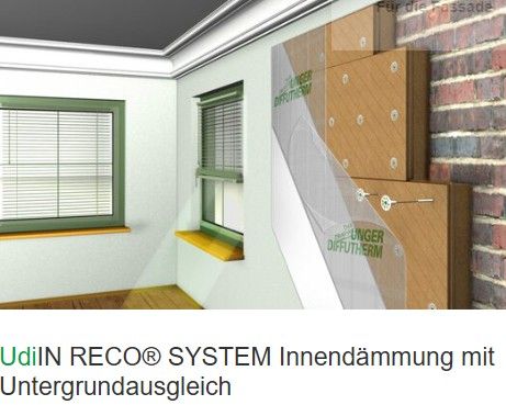 Die Beschichtung beim System UdiIN RECO erfolgt ohne spezielle Dampfbremse aber zwingend mit einem dampfregulierenden mineralischen Spachtel (Multigrund) und Armierungsgewebe. Eine Hinterlüftung kann durch die eng anliegende Holzweichfaser bei richtiger Montage weitestgehend verhindert werden. Dieses System lässt sich insbesondere bei zerklüfteten Mauerwerken oder Fachwerkwänden sehr gut handhaben. Aber auch bei allen anderen Innendämmungen scheint das System gut geeignet.