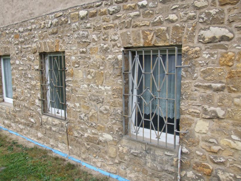 | Zerklüftetes Mauerwerk aus Natursteinen | Wärmedämmputz am unteren Teil des Gebäudes zur Egalisierung des zerklüfteten Mauerwerkes |
