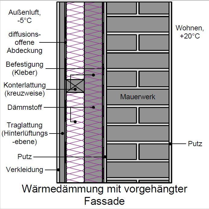 Dabei ist darauf zu achten, das der Dämmstoff nicht hinterlüftet werden kann. Bei weichen Dämmstoffmatten (z.B. Mineralwolle, Holzweichfaser) erreicht man dies z.B. durch das Einbringen des Dämmstoffes in zwei Lagen, wobei nach der ersten Lage durch erneute kreuzweise Verlattung der Dämmstoff der ersten Lage leicht gedrückt und niedergehalten wird. Die zweite Lage wird mit der Konterlatte (Montagelatte für Fassadenelemente) gehalten. Die Abstände der Verlattung sind nach den Herstellerangaben der Fassadenelemente, aber nicht großer als etwa 50 cm zu wählen.