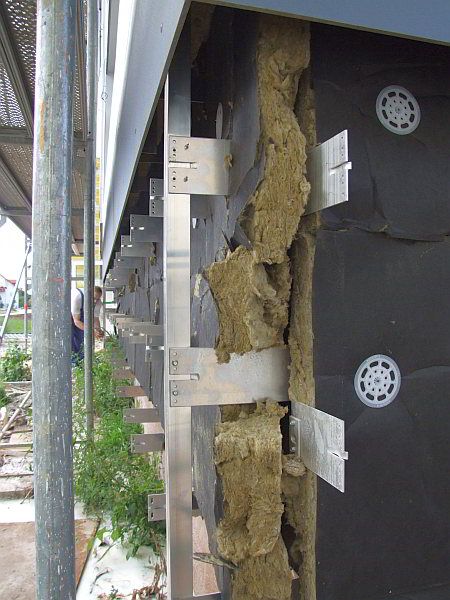 Spezielle Systeme der Wärmedämmung mit hinterlüfteter Fassade mit Natur- oder Kunststeinen als Fassadenelemente erfordern Aluminium- oder Edelstahlprofile als Unterkonstruktion. Unterkonstruktionen aus Metallschienen, wie sie bei Ständerwänden im Leichtbau verwendet werden, sind wegen der starken Wärmebrückenwirkung nicht empfehlenswert. Außerdem kommt es bei solchen Systemen häufig zu schwer wiegenden Ausführungsmängeln. Ich halte wärmegedämmte hinterlüftete Fassaden mit Schienen und Tragankern aus Aluminium oder Edelstahl prinzipiell für nicht geeignet.