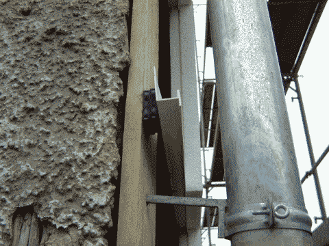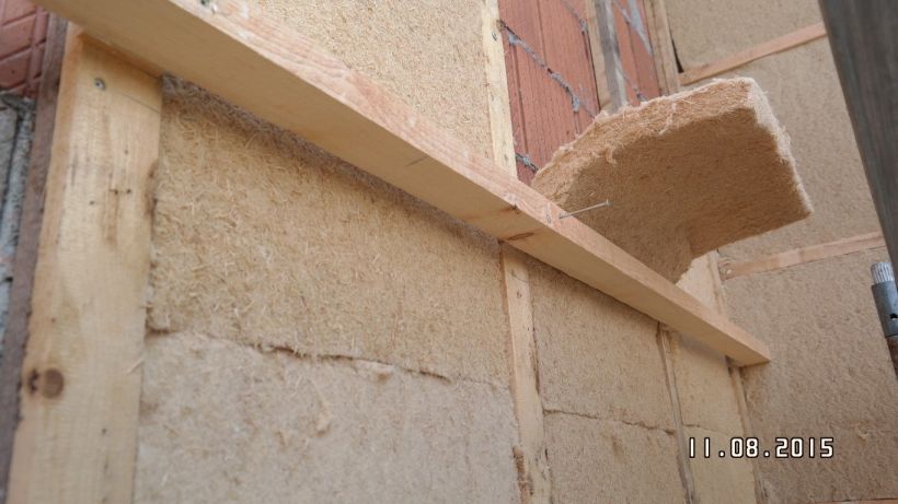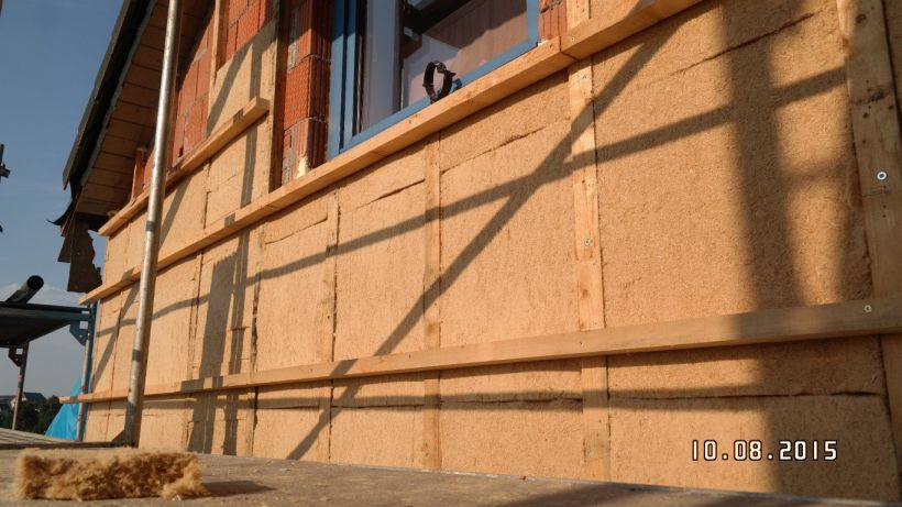 Werden die recht biegesteifen Schaumpolystyrol- oder Holzfaserdämmplatten verwendet, kann der Dämmstoff auch durch Aufschrauben einer breiten (6 bis 8 cm), anpressenden Konterlatte gehalten werden. Vorheriges Ankleben der Platten mit umlaufender Mörtelwulst und Klebepunkten ist dann - wie bei einem Wärmedämmverbundsystem - empfehlenswert.