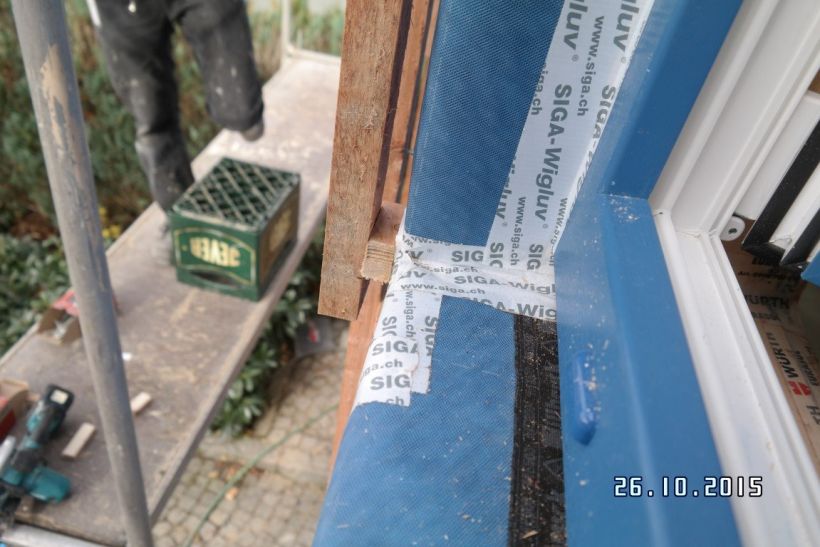 Die Bahnen sind im Überdeckungsbereich mit dafür geeigneten Klebebändern winddicht abzukleben. Besondere Aufmerksamkeit erfordern die Anschlüsse an Fenstern und Türen. Die Bahnen sind bis auf den Rahmen zu führen und hier dauerhaft abzukleben. Dieser Arbeitsschritt muss schon vor der Entscheidung für eine Wärmedämmung mit hinterlüfteter Fassade durchdacht werden, da oftmals die zur Verfügung stehenden Rahmenbreiten für eine Verklebung und Abdeckung mit Fassadenelementen nicht ausreichen. Kann hier nicht sorgfältig abgedichtet werden, sollte besser ein Wärmedämmverbundsystem montiert werden.
