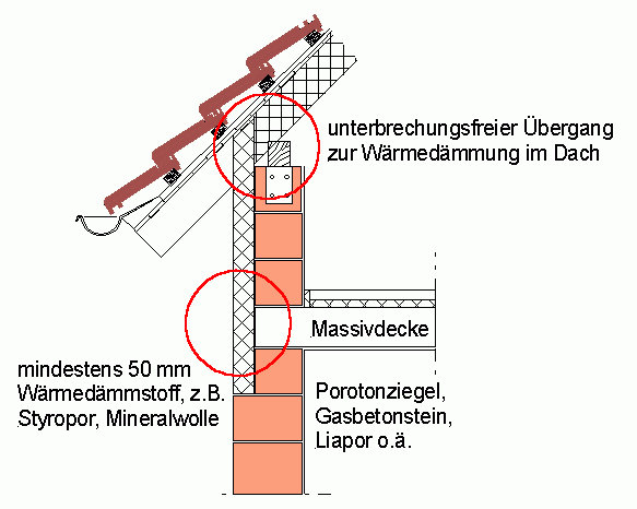 Allerdings ist die in der Zeichnung angegebene Dämmstoffstärke von 50 mm nicht mehr zeitgemäß. Sie sollte auf wenigstens 120 mm erhöht werden. Die genaue, planungsgerechte Ausführung dieses Details ist abhängig von den Mauersteinen, der Stärke der Wand und dem Deckenauflager. Die Ausführung muss auf der Baustelle überwacht werden. Es darf nicht verschwiegen werden, dass eine solche Ausführung zu einem erhöhten technologischen Aufwand führt.