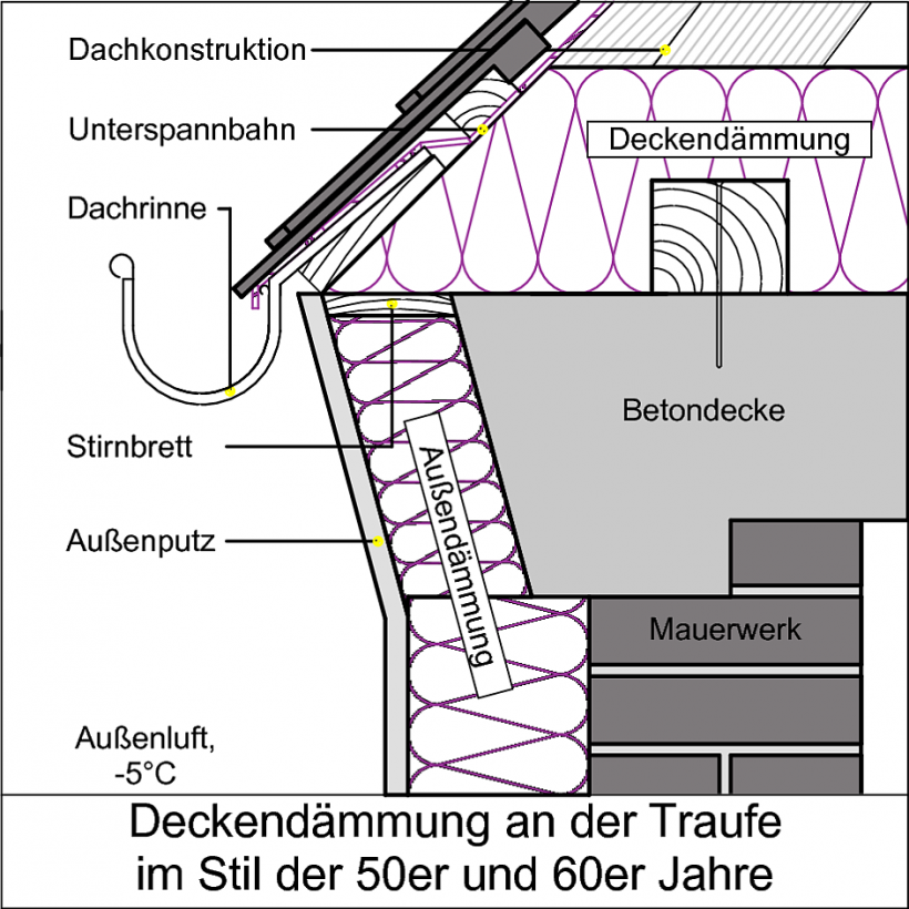Eine häufig auffällige Konstruktion stellen auskragende Gesimselemente in Höhe der obersten Geschossdecke dar (60er Jahre), die Aufgrund des vergleichsweise hohen Aufwandes oft nicht in eine Dämmmaßnahme einbezogen werden.