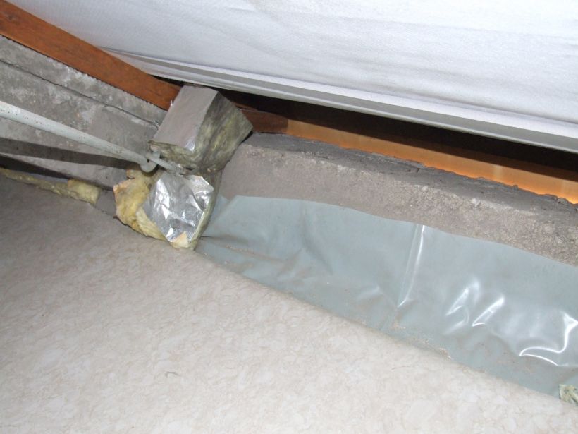 Eine andere Möglichkeit besteht darin, eine Holzlattenkonstruktion anzubringen, die mit Holzweichfasermatten, Mineralwolle oder einem ähnlichen mattenähnlichen Dämmstoff ausgefüllt wird. Danach wird eine lückenlose und luftdichtende feuchtevariable Dampfbremse (siehe Abbildung) eingebaut. Eine Lattung schafft Installationsraum und dient dem Anschrauben von Gipskarton- oder Gipsfaserplatten. Ränder (Übergänge von Gipskartonplatten zur Wand) sind mit Acryl zu verschließen.