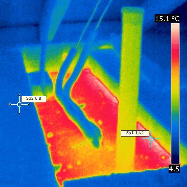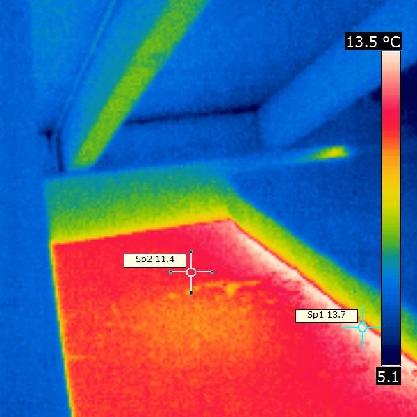Im Thermogramm ist der erhebliche Wärmeverlust über die Gesimskonstruktion deutlich erkennbar. Raumseitig findet sich – wegen der innen abgesenkten Oberflächentemperatur – oft Schimmel. Die Lösung ist aufwändig, erspart aber den Nutzern Ärger mit dem Schimmelpilz.