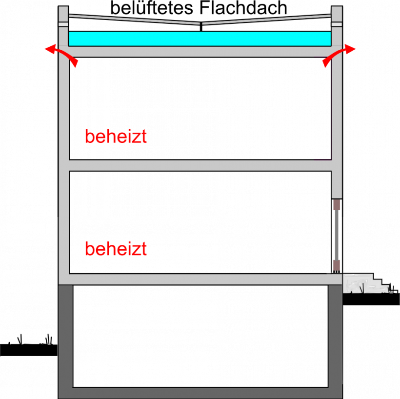 Das Aufblasen von Zellulosedämmstoff (türkis dargestellt) eignet sich auch für die Dämmung der obersten Geschossdecken in Häusern mit Beton-Flachdach (z.B. Mehrfamilienhäuser, kommunale Gebäude, Kita’s u.a.). Insbesondere bei nicht begehbaren Konstruktionen, z.B. bei Betondecken, ist das Einblasen oftmals die einzige Möglichkeit, eine gute und nachhaltige Dämmung aufzubringen. Allerdings bleiben Wärmebrücken im Randbereich der gedämmten Geschossdecke erhalten (rote Pfeile). Sie lassen sich nur durch eine zusätzliche Außendämmung (z.B. WDVS) kompensieren.