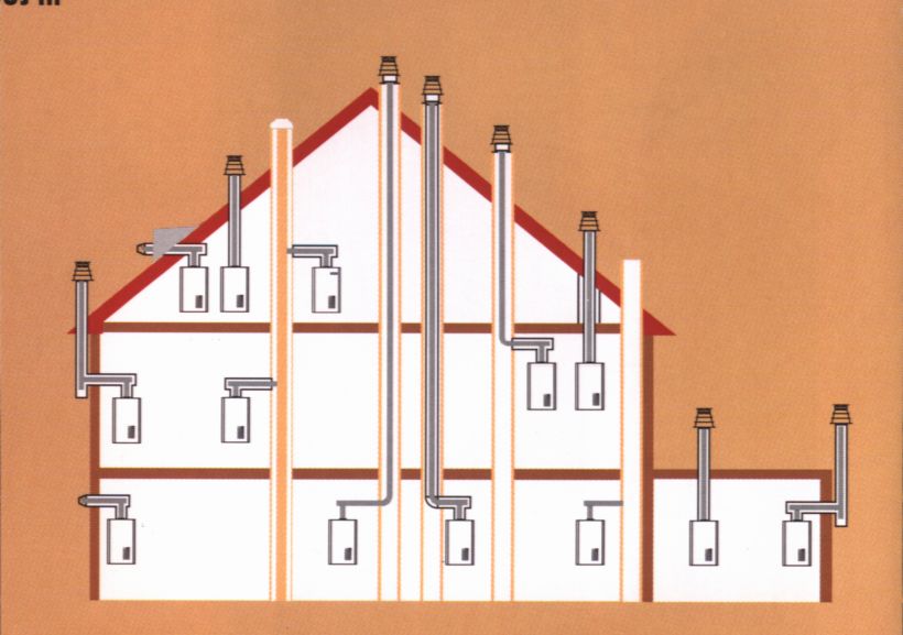 Abgasrohre bei konventionellen, atmosphärischen Gas-Heizkesseln werden der höheren Temperatur bis zum Schornstein aus Metall ausgeführt und ohne spezielle Dichtungen zusammensteckt. Für Brennwertgeräte werden statt dessen mit Lippendichtungen versehene Kunststoffrohre verwendet, die druckdicht verbunden sind.