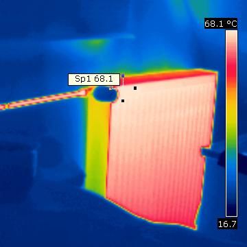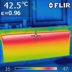 - Wenden Sie sich nach einigen Minuten dem Heizkörper zu, der der Pumpe am nächsten liegt. Dieser sollte, wenn die Vor-Einstellung stimmt, von oben gesehen im ersten Drittel etwa 50°C warm sein. Ab dem dritten Drittel nach unten sollte die Temperatur auf etwa 30°C bis 35°C absinken. Die Spreizung (Differenz zwischen der Vorlauftemperatur und der Rücklauftemperatur) sollte etwa 15 bis 20 Grad betragen. Gemessen wird mit dem Infrarotthermometer (Laserpointer), das in einem Abstand von 30 bis 40 cm auf den Heizkörper gerichtet ist. Achtung: Eine Messung von Temperaturen auf den blanken Verschraubungen des Vor-und Rücklaufes wäre fehlerhaft, daher muss ein Infrarotthermometer auf die lackierte Oberfläche des Heizköpers "schauen". Tragen Sie die gemessene Höchsttemperatur für den Vorlauf und den Rücklauf in Ihre Tabelle ein. Liegt die Rücklauftemperatur deutlich über den anvisierten 30 bis 35°C, ist die durch den Heizkörper fließende Wassermenge zu hoch (es sollte in diesem Fall eventuell auch schon hörbar rauschen). Liegt die Rücklauftemperatur deutlich darunter ist die Durchflussmenge zu gering. Ändern Sie den Durchfluss am Voreinstellring bzw. in der Rücklaufverschraubung. Ob es mehr oder weniger wird, lässt sich eventuell mit Hilfe eines Stethoskops besser hörbar machen. Achtung: Die Verstellung sollte nur in minimalen Drehbewegungen bzw. Schritten vorgenommen werden. Notieren Sie die Einstellwerte bzw. die Drehbewegungen. Es muss klar sein, dass die Änderung der Voreinstellung eines Thermostatventiles mehr oder weniger große Auswirkungen auf das Verhalten aller anderen Heizköper haben wird.