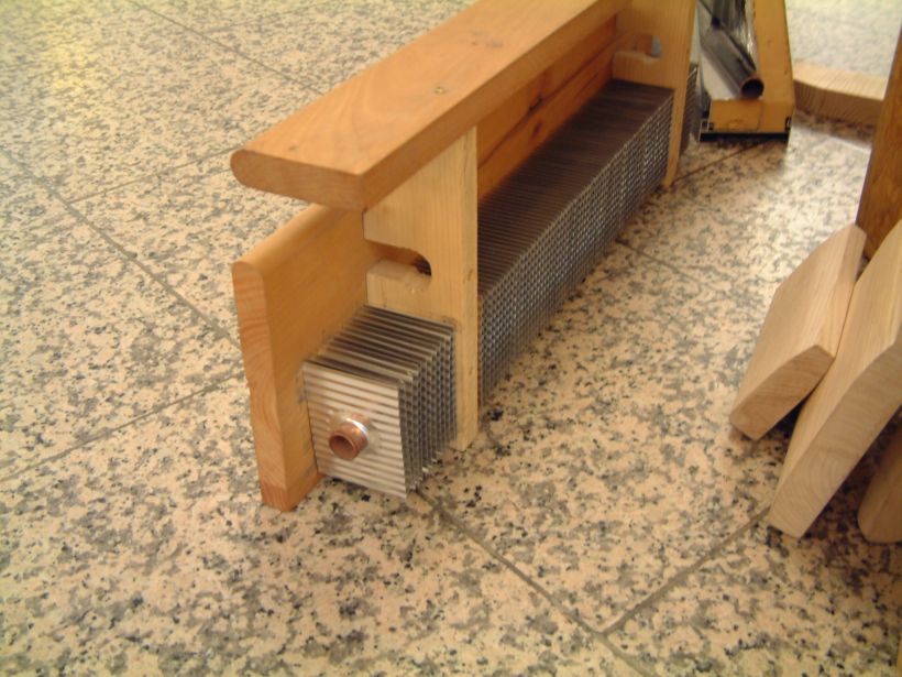 Aufbau: um ein Heizrohr (Kupfer) sind Lamellen (Aluminium) zur Vergrößerung der wärmeabgebenden Oberfläche angebracht; ein oder mehrere solcher Heizrohre befinden sich bei Fertigkonvektoren in einem Schachtelement; der Schacht kann auch durch nachträgliches Anbringen von vorgehängten Platten, Brettern o. ä. gebildet werden; nach Erwärmung der Umgebungsluft an den warmen Lamellen steigt die Luft nach oben und tritt aus dem Konvektor aus; je höher das Schachtelement (Kaminwirkung) und die Temperatur des Heizungswassers, je größer die wärmeübertragende Oberfläche, um so höher ist die Wärmeleistung