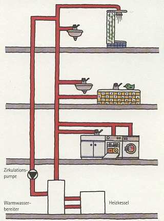 Eine Zirkulationspumpe und eine Zirkulationsleitung sorgen dafür, dass warmes Wasser an den Zapfstellen zur Zeit des Pumpenbetriebes ohne nennenswerte Wartezeit verfügbar ist. Dazu wird eine Rohrleitung vom entferntesten Punkt des Warmwasserstranges zum Speicher zurückgeführt. Warmes Wasser wird nun mittels einer Umwälzpumpe im Kreislauf gehalten und so dem Speicher immer wieder abgekühltes Wasser zugeführt. Heißes Wasser aus dem Speicher strömt in der Warmwasserleitung nach und fließt an den meist kurzen Abzweigen zur Dusche, dem Waschbecken, der Küchenspüle usw. vorbei. Während des Pumpenbetriebes weist das Wasser im gesamten Netz annähernd die gleiche Temperatur wie im Speicher auf. Wird ein Warmwasserhahn geöffnet, steht unmittelbar nach Abfluss der geringen, abgekühlten Wassermenge zwischen Leitungsabzweig und Hahn sofort warmes Wasser zur Verfügung.