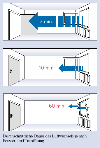 - Ausreichend belüftet ist eine beheizte Wohnung mit dicht schließenden Fenstern in der Regel erst, wenn alle, auch wenig bzw. nicht benutzte Räume, mindestens 4 mal täglich intensiv gelüftet werden.