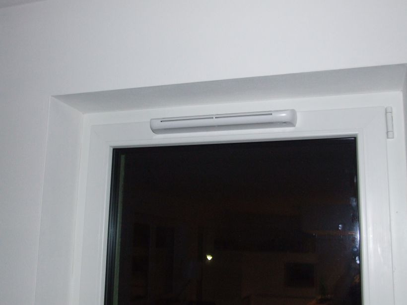 Um dem Luftwechsel von der Höhe der Raumluftfeuchte abhängig zu machen, habe ich mich für die zum Aereco-System gehörigen feuchtegeregelten Zuluft-Ventile entschieden. Der von der Luftfeuchtigkeit abhängige Luftdurchsatzes ist einfach, preiswert und ohne Fremdenergieaufwand zu realisieren. Außerdem bildet die Höhe der Raumluftfeuchte recht gut die Nutzung der Räume ab. Die Fräslöcher im Rahmenprofil der Fenster wurden noch während der Fensterproduktion im Werk nach entsprechenden Schablone angefertigt. Eine nachträgliche Herstellung solche Fräsungen ist bei zahlreichen Profilen und auch bei Holzfenstern möglich.