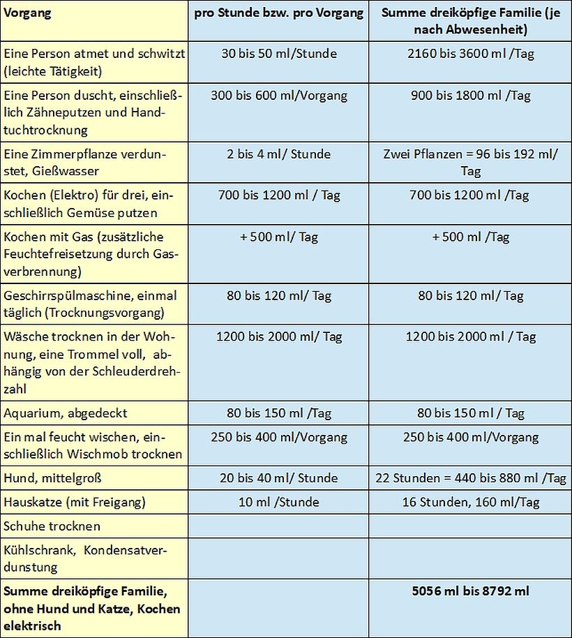 Unsere dreiköpfige Beispielfamilie wohnt in einem Mehrfamilienhaus auf 80 m². Die Wohnung hat eine Wohnraumhöhe von 2,50 m, woraus sich ein Volumen von 200 Kubikmetern errechnet. Bei durchschnittlich 20 °C Raumtemperatur und einer relativen Luftfeuchtigkeit von 60% sind 10,4 Gramm Wasserdampf in einem m³ Raumluft gelöst. Das ergibt 10,4 Gramm pro Kubikmeter Raumluft mal 200 m³ = 2080 Gramm Wasser. Und etwa 5 bis 9 Liter Wasser, je nach Nutzung, Familiengröße, usw. kommen jeden Tag hinzu.